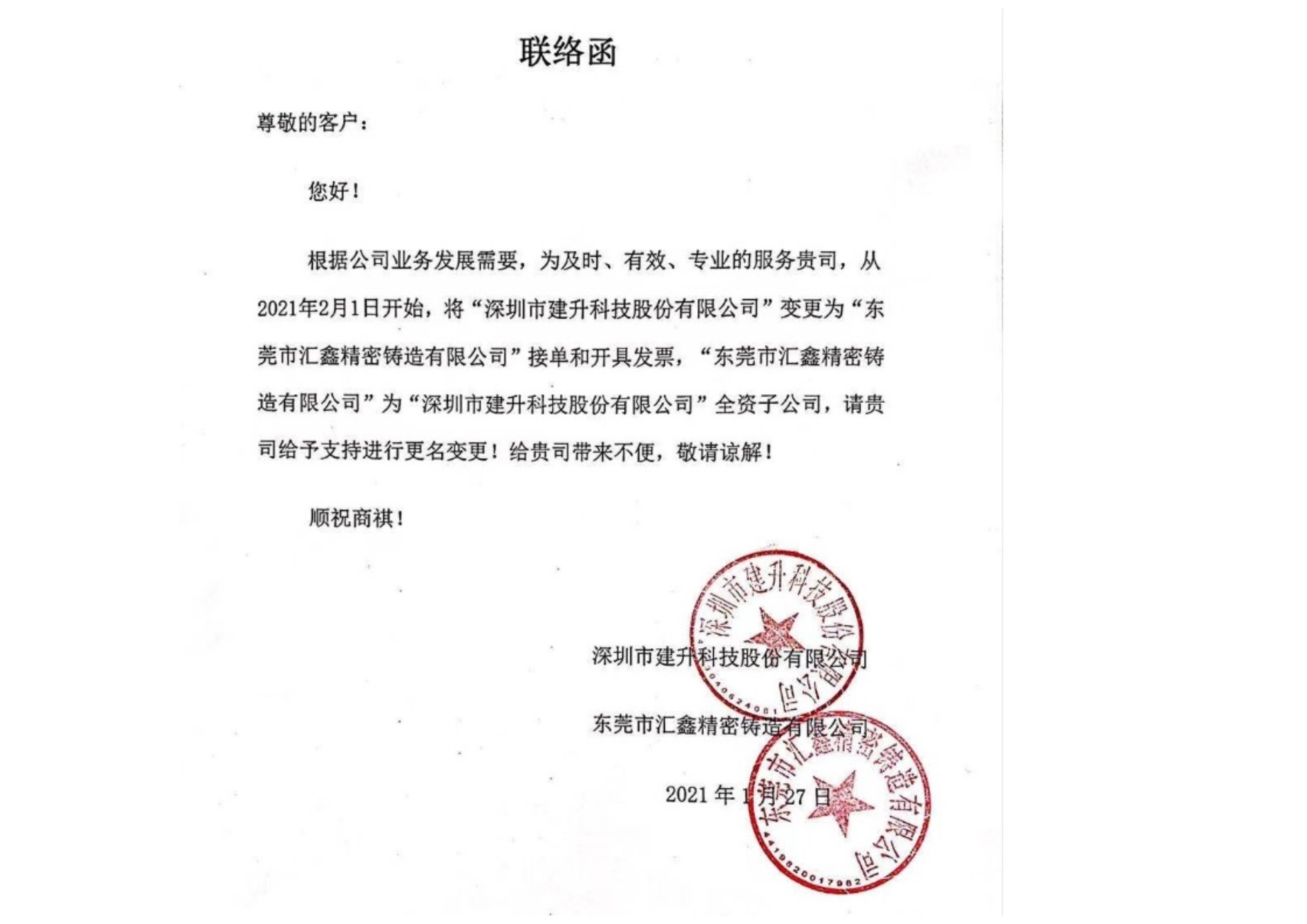 交易主體 變更通知 深圳建升變更至東莞匯鑫